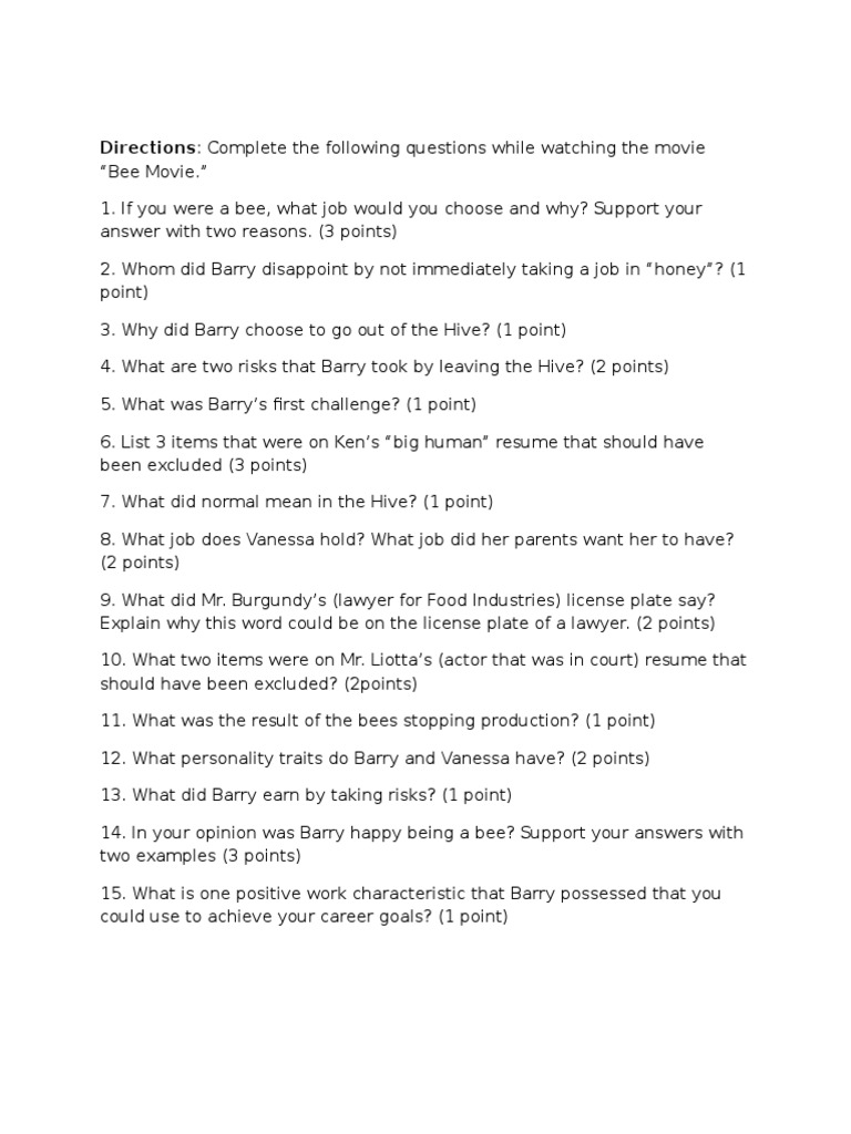 The bee movie worksheet answers