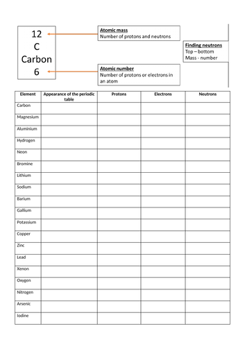 Finding Protons, Neutrons and Electrons. This simple worksheet shows students how to use the Periodic Table to find the element name, symbol, atomic number, mass number and then use that information to identify the number of protons, neutrons and electrons in the atom.