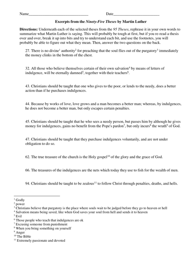 19 Aug 2015 — Excerpts from Martin Luther's 95 Theses. Subject: History. Age range: 14 - 16. Resource type: Worksheet/Activity. 51 review. Rating: 5 · 1 review