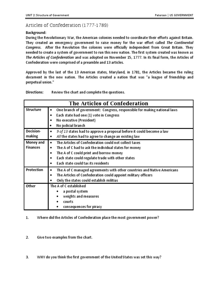 Can the Articles of Confederation solve this problem? Why/Why not? U.S. History Name. Articles of Confederation Worksheet. The term " ...Structure: One branch of government: Congress, ...Decision-making: 9 of 13 states had to approve ...Money and Finances: The Articles of Confeder...