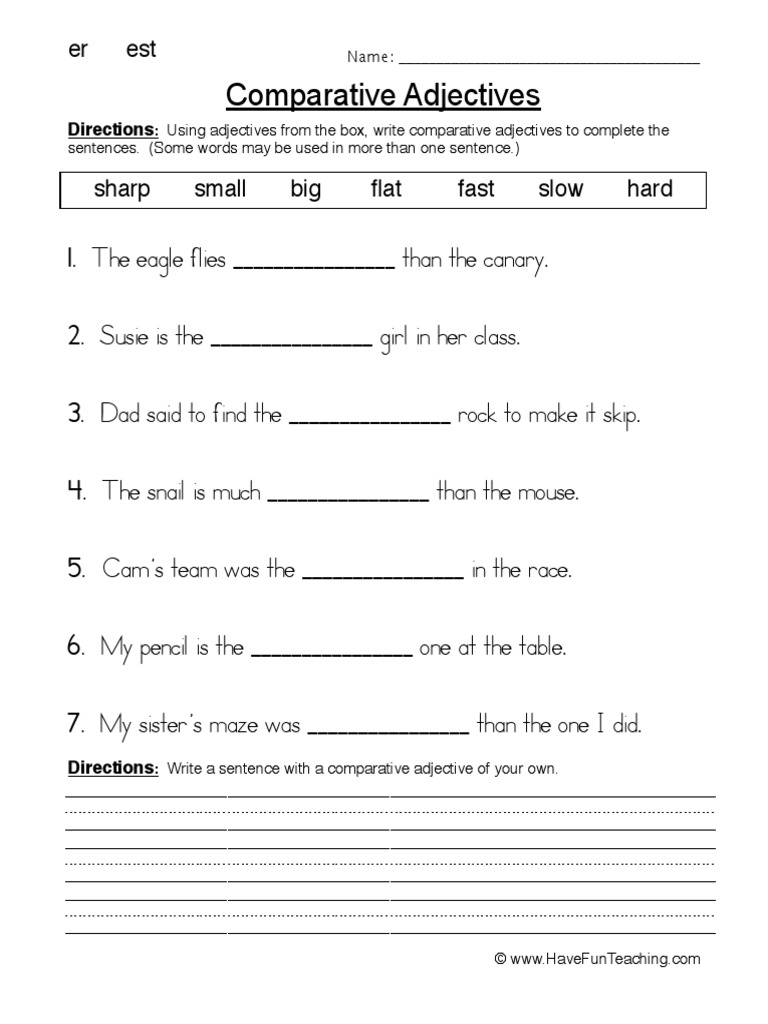 The same adjective can be used to describe something, compare two items or compare an item to a group of items ( slow, slower, slowest ). In these worksheets, students practice using the adjectives in the normal, comparative and superlative form. Open PDF. Worksheet #1 Worksheet #2 Worksheet #3. Similar: