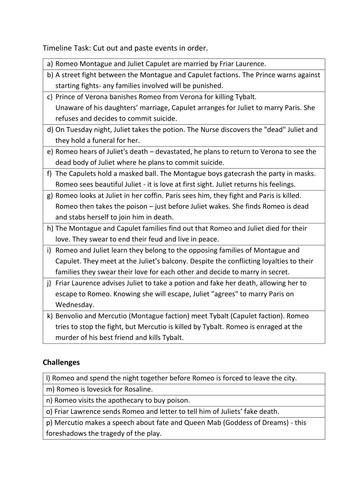 Jan 25, 2018 - Challenge students to a deep understanding of the dramatic structure of Romeo and Juliet with this timeline activity. It requires students to synthesize the major events from the play and can be done as a group activity or individually, in class or as homework. This resource includes a student assig...