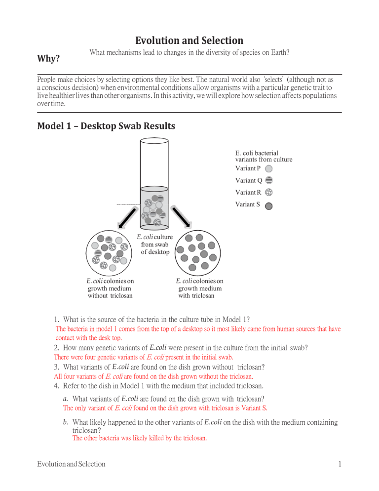 Evolution and Selection 1 Evolution and Selection Why? ... 2 POGIL™ Activities for High School Biology 5. Based on its effect on E.coli, ... Support your answer. If the desktop was cleaned with a solution containing triclosan, some living E. coli would remain because Pogil Evolution And Selection Answers Bing. BIOLOGY POGIL ANSWER KEY EVOLUTION AND SELECTION PDF. Evolution And Selection Key Pogil People Make Choices By.