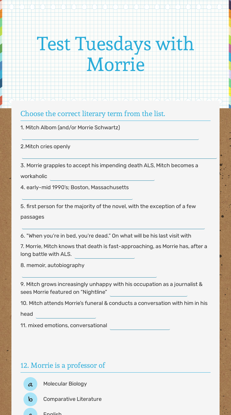 Tuesdays with morrie worksheets. Discover learning games guided lessons and other interactive activities for children. Tuesdays with Morrie Worksheet 1 Part 1 and 2 Answer the questions in the form of personal notes in a few words in order to prepare for class discussion PART 1 COMPREHENSION 1. Introductory PowerPoint on Tuesdays with Morrie.