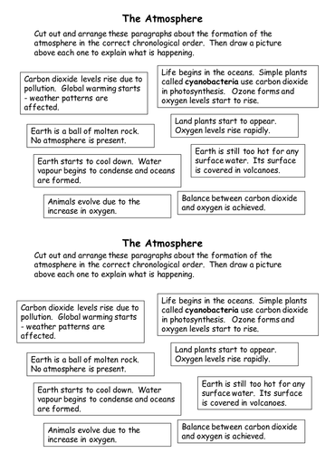 Climate change is a shift in those average conditions. The rapid climate change we are now seeing is caused by humans using oil, gas and coal for their homes And as frozen ground melts in places like Siberia, greenhouse gases trapped for centuries will be released into the atmosphere, worsening... Print Atmosphere Worksheets. Click the buttons to print each worksheet and associated answer key. The exosphere contains the lightest gases in the atmosphere. Hydrogen is dispersed throughout The changes in the density of the gases caused by the intermittent expansion of the... The evolution of life caused dramatic changes in the composition of the earth's atmosphere, which did not originally contain oxygen. Science Background for Teachers Geologic time is largely subdivided on the basis of the evolution of life and on the amount and type of crustal activity that occurred in the past.