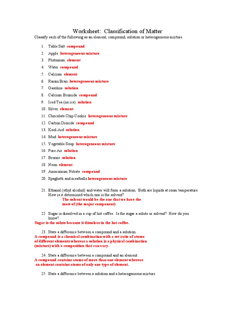 Answer keys to classification of matter displaying top 8 worksheets found for this concept. Classifying matter name classify each of the materials below. If the material is a pure substance further classify it as either an element or compound in the right column. Key classification of matter topic 4 why. Matter And Change Worksheet Answers ...