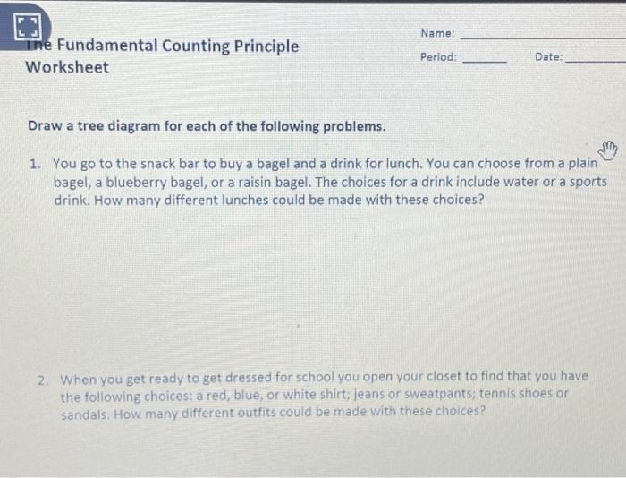 Fundamental counting principle worksheet answers. Fundamental counting principle worksheet pdf. Fundamental counting principle to find the number of different plates. You are taking a survey on your experience at taco bell. How many ways can 5 paintings be line up on a wall. For the first five questions you can answer below average average or above average for each question. Fundamental Principle of Counting Page 1 of 2 Student Activity: To examine the Fundamental Principle of Counting. Use in conjunction with the file "Fundamental Principle of Counting" on the Student's CD. 1. John is buying a car and he has a choice of 3 makes in his price range. Each car comes in 4 colours. October 17, 2021. August 13, 2021 By. admin. Fundamental Counting Principle Worksheet. Allowed to be able to my blog, in this particular period I'll show you with regards to Fundamental Counting Principle Worksheet. Why don't you consider impression above? can be that remarkable???. if you think therefore, I'l m demonstrate a few image ... [ r e A c l ` l S A r M i j g ` h _ t d s G x r G e l s K e k r C v x e ` d T.-1-Answer the following questions. Identify if it is a fundamental counting principle problem (FCP), permutation (P), distinguisable permutation (DP), combination (C) or mixture of several types (M). Then solve the problem by showing work. Just an answer will not be ...