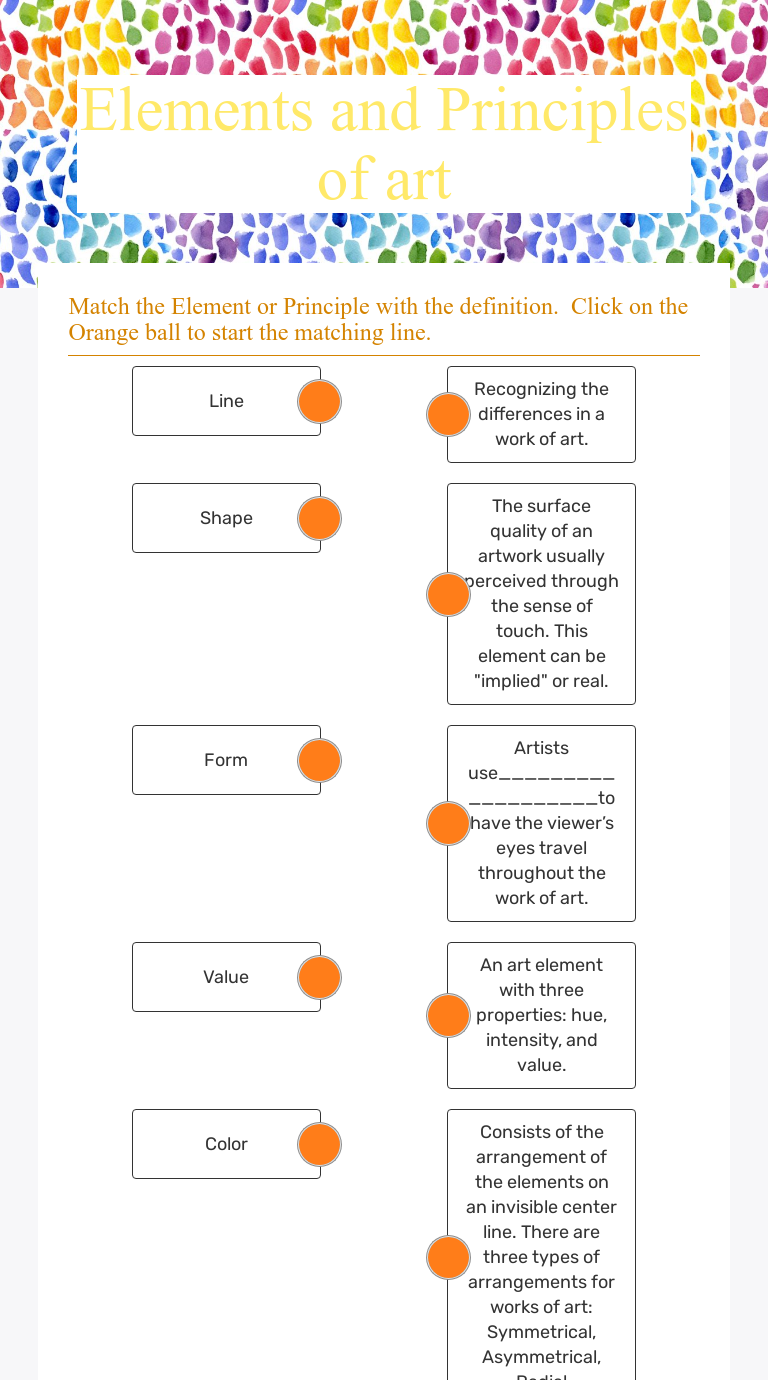 Principles of Art (Design) Worksheets (USA color) This package contains 7 sheets covering the Elements of Art/Design (each as a student version and a teacher version) - 14 pages total This package uses the USA spelling of color. If you would prefer colour, please see my store for the other version.