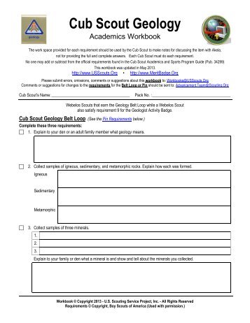 Webelos Geologist Activity Pin Worksheet - Geology Merit Badge While you are a Webelos Scout, earn the Cub Scout Academics belt loop for Geology. This website is not affiliated or officially sponsored by the Boys Scouts of America. Questions should be addressed to webmaster@geologymeritbadge.com. Home. Requirements. Worksheet. Resources. Pictures. Geology Merit Badge