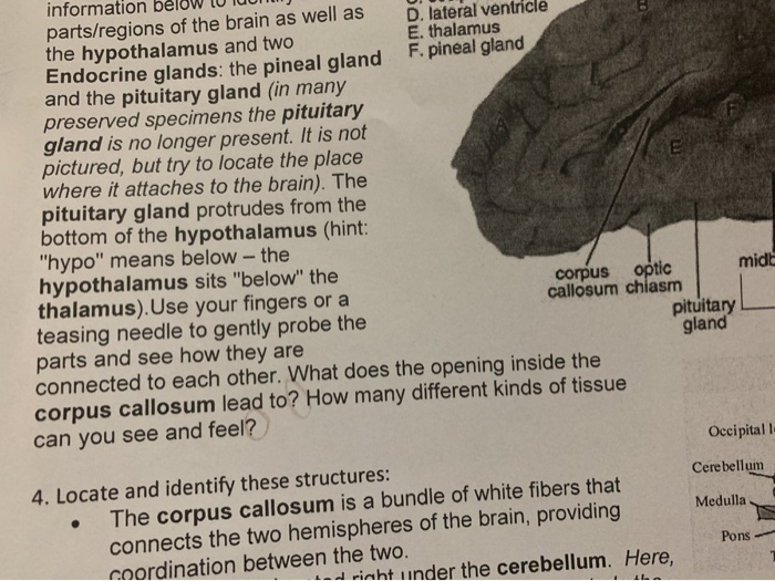 Sheep brain dissection by Lucie Turner Brain Dissection Corpus callosum - bundle of white fibres that connects the 2 hemispheres Using a sheep brain to examine brain structure Medulla - where nerves cross over. Controls heartbeat and respiration. Pons - relays messages between cerebrum and cerebellum Pituitary gland