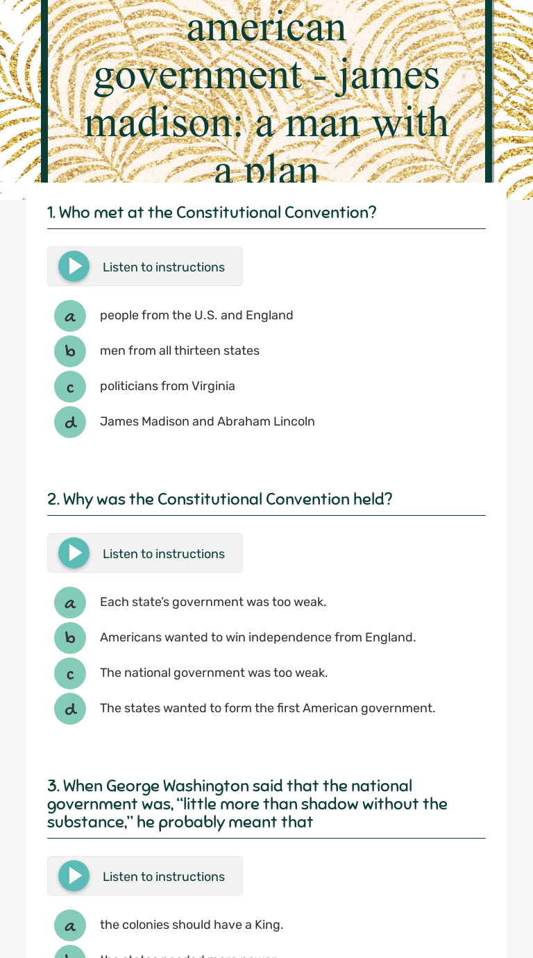 American government worksheet answers. DOC American Government Worksheet - Chapter 5 American Government Worksheet - Chapter 5. What is a political party? What are the two major political parties in American politics? What are the three major components of a political party? Describe at least four major functions of a political party. Define politics, partisan, party in power, loyal opposition. American Government (Lewis) Chapter 13 Worksheet ... Start studying American Government (Lewis) Chapter 13 Worksheet. Learn vocabulary, terms, and more with flashcards, games, and other study tools. Civics Questions for the 2008 Naturalization Civics Test The 100 civics (history and government) questions and answers for the naturalization test are listed below. The civics test is an oral test and the USCIS Officer will ask the applicant up to 10 of the 100 civics questions. An applicant must answer 6 out of 10 questions correctly to pass the civics portion of the naturalization test. On the naturalization test, some answers may change … Chapter 2 Origins Of American Government Worksheet Answers ... American government chapter 7 section 3 money and elections worksheet answers. Colonial leaders such as benjamin franklin thomas jefferson and james madison regarded these ideas as political truth. All persons having origins in any of the black racial groups of Africa Bureau of Indian Affairs You can just read the titles.