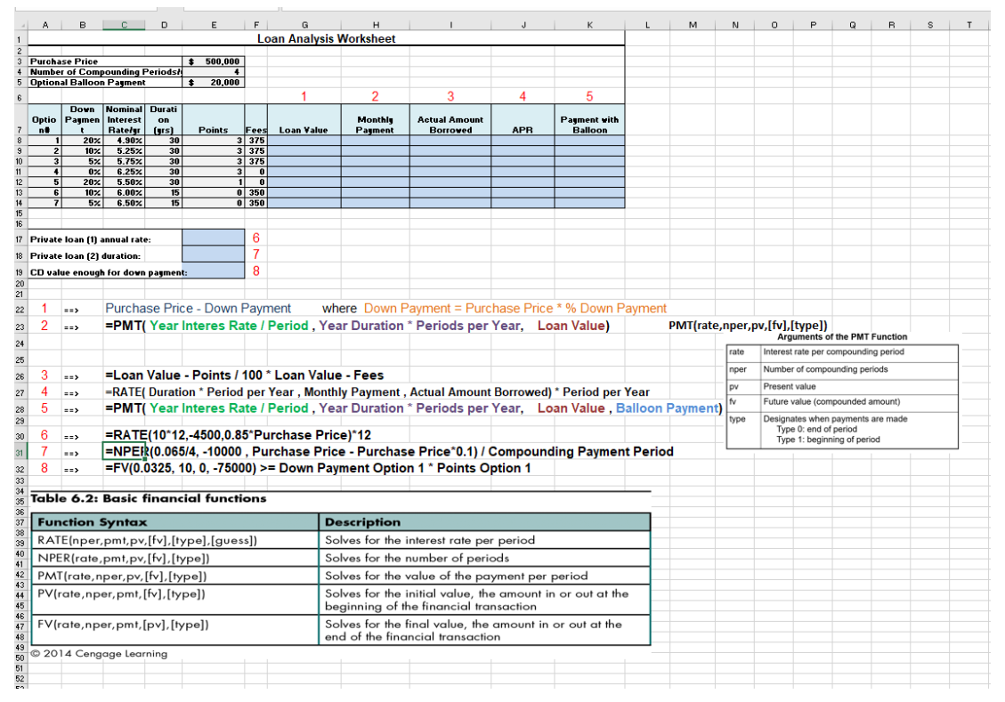 Below is a worksheet you can use to start to do some economic analysis to compare mortgages. The first seven lines set the basis for the analysis and the remaining lines track the balance of the mortgage from the initial loan balance until the loan is paid off, a process known as amortization.