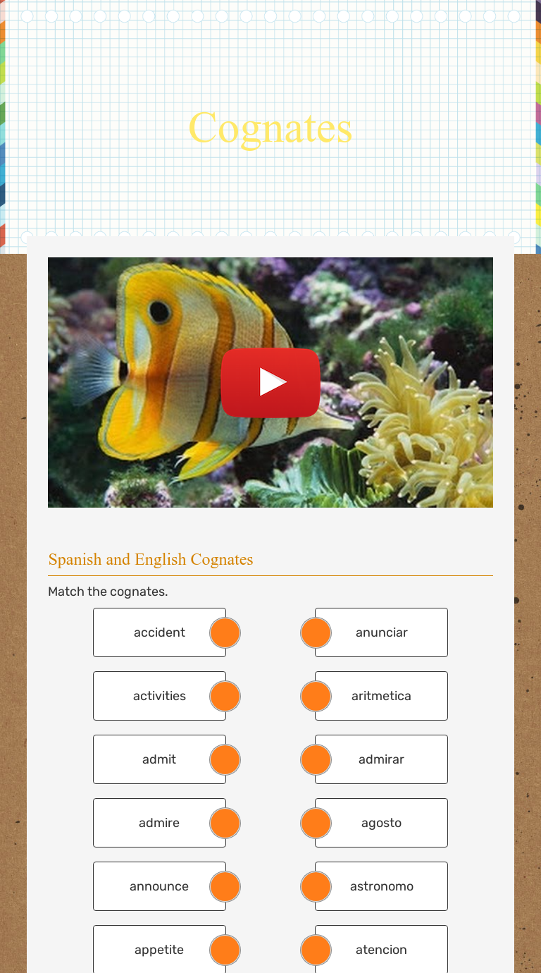 Cognates worksheet - Liveworksheets.com More Cognates interactive worksheets. Cognate Words English Spanish. by mrssantiago. Cognate, Perfect Cognate or False Cognate. by veleznixida. Cognates and false cognates. by cpinzonrodrigez. Cognate Words. by mrssantiago.