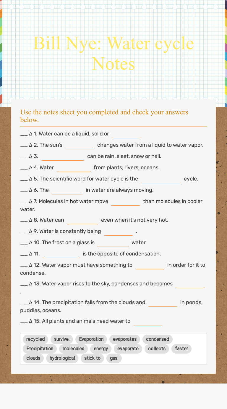 Bill Nye Water Cycle Worksheets - Teacher Worksheets Some of the worksheets displayed are 18 water cycle, Bill nye phases of matter, Name principles of matter, Bill nye video guides, 19 phases of matter, Ater cle water goes round round, The water cycle, 3 4 2 lesson 2 the cycle of water. Once you find your worksheet, click on pop-out icon or print icon to...