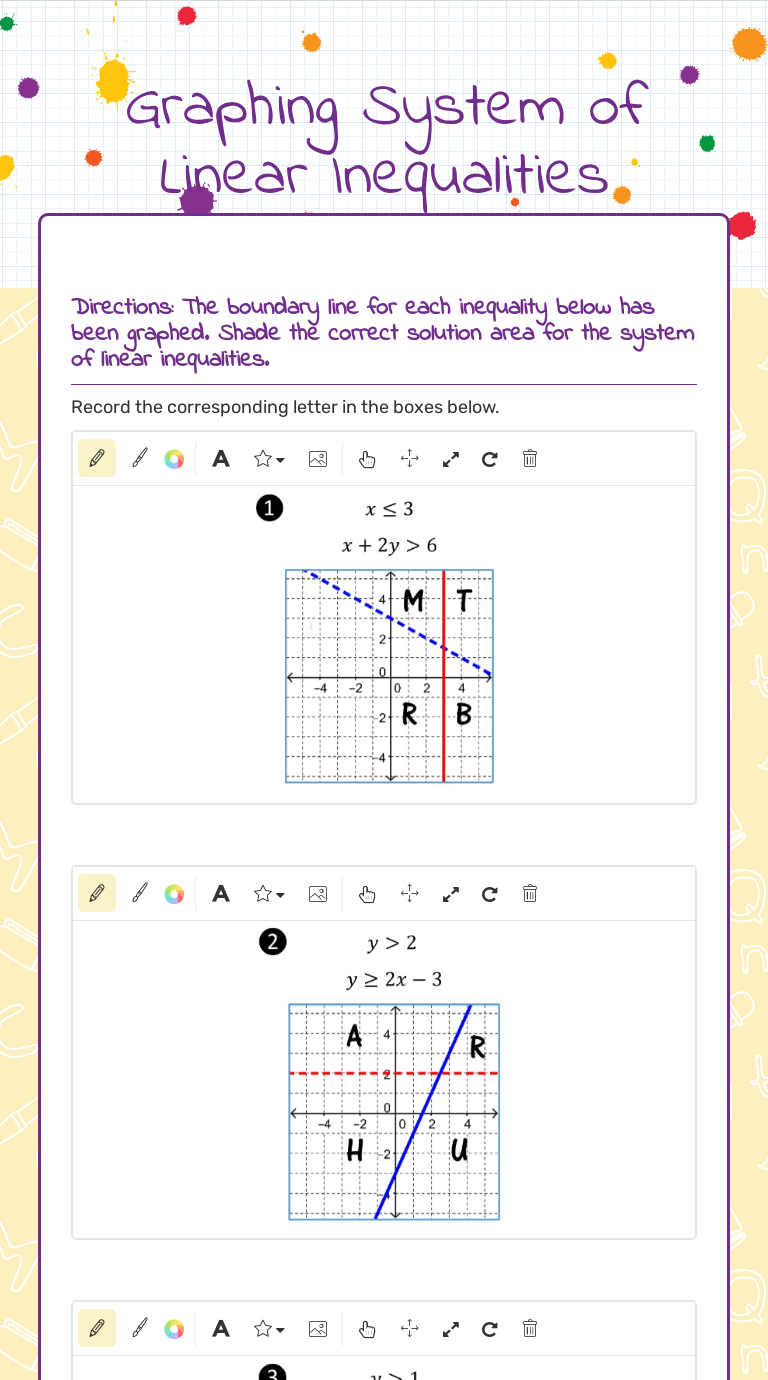 Graphing Systems of Inequalities Worksheets Students begin to work with Graphing Systems of Inequalities in a series of math worksheets, lessons, and homework. inequality already has "y" on the left and everything else on the right, so no need to rearrange Plot y=2x-1 (as a solid line because y≤ includes equal to) Shade the area below...