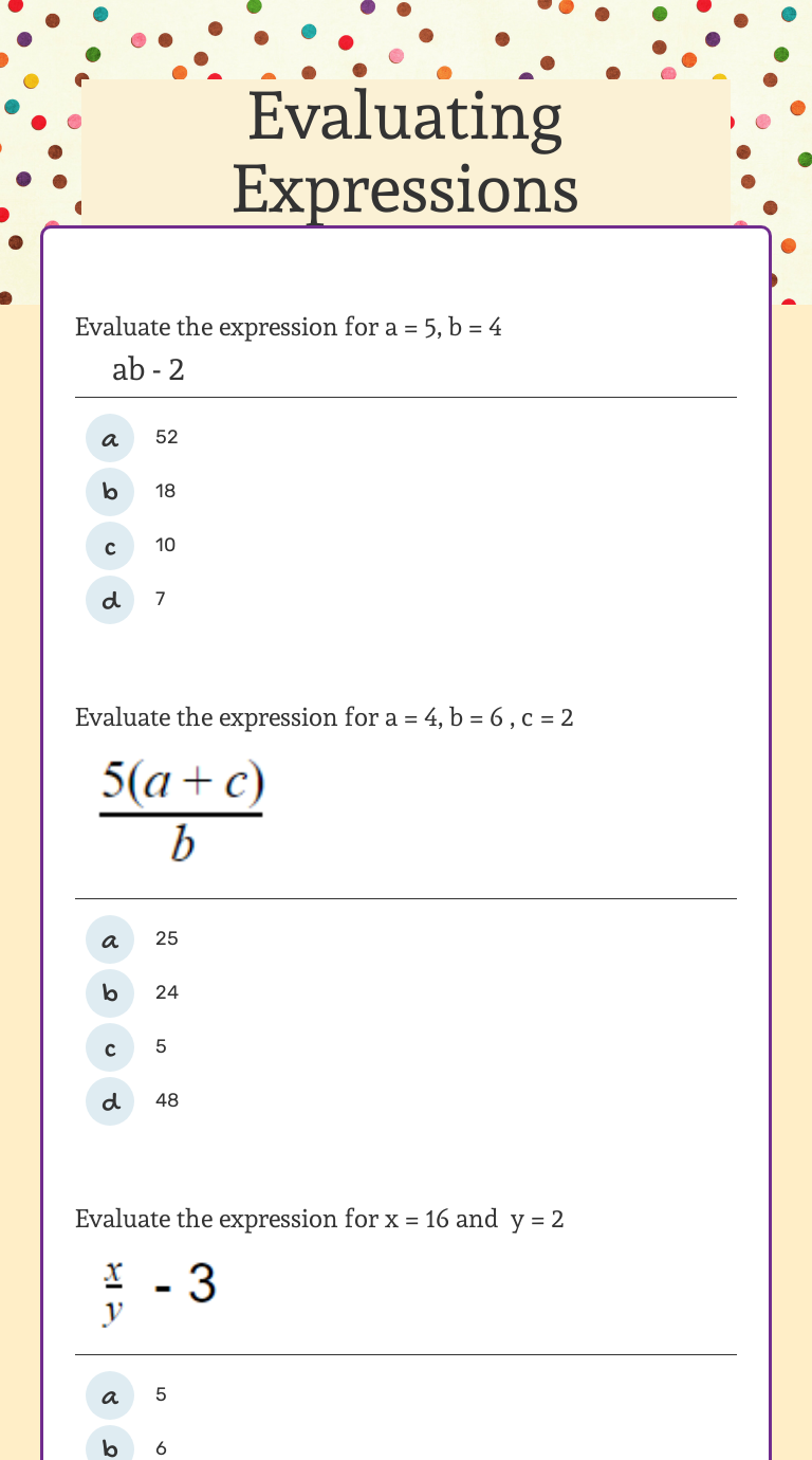 Evaluate Expressions Worksheet - Kiddy Math Some of the worksheets for this concept are Evaluating expressions date period, Evaluating variable expressions, Evaluate expressions work, Evaluate the expressions, Evaluating algebraic expressions using integer values, Basic algebra, Evaluating algebraic expressions when...