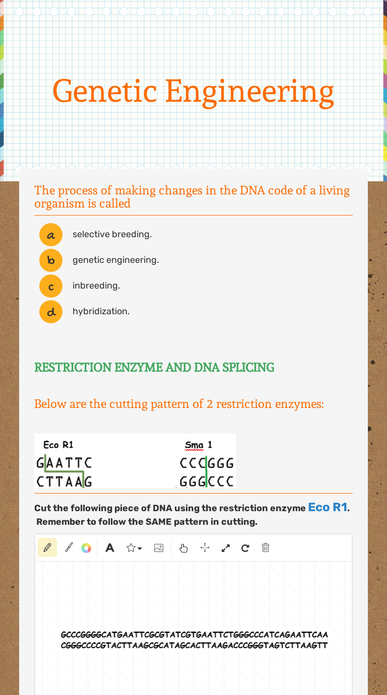 PDF Restriction enzymes worksheet answers Restriction enzymes worksheet answers Restriction Enzyme Worksheet Name: Date: Restriction enzymes are designed to cut (or cleave) DNA at specific sites. The sample below will show you how this works. The following DNA segment will be cut with Eco R1. Eco R1 cuts where it finds the sequence GAATTC. It will cut between the G and AATTC. 1.