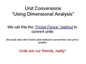 Dimensional Analysis (also called Factor-Label Method or the Unit Factor Method) is a problem-solving method that uses the fact that any number or expression can be multiplied by one without changing its value. It is a useful technique. solve these problems we will apply the factor-label (dimensional analysis) method you mastered early in the class, and we will frequently use scientific notation. Remember chapter 3 you followed the procedure: what you are = what you are X a fraction or series of fractions where the =