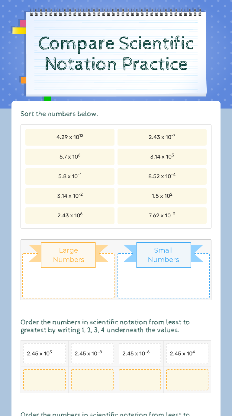 Comparing And Ordering Scientific Notation Worksheets ... 220. $2.00. PDF. Fraction, Decimal, Percent, Scientific Notation Drag and Drop ActivityStudents will practice comparing and ordering fractions, decimals, percents, and numbers written in scientific notation in both ascending and descending order with this drag and drop activity. There are 8 rows with 5 values in ea.