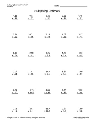 Multiplying Decimals worksheets and online exercises Multiplying Decimals worksheets and online activities. Free interactive exercises to practice online or download as pdf to print.