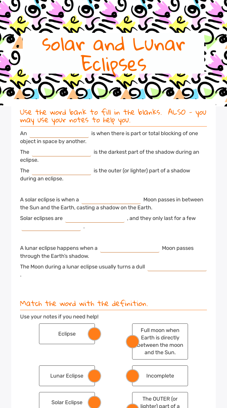Solar and Lunar Eclipses | Worksheet | Education.com Investigate solar and lunar eclipses with this fun and colorful science worksheet. Students interested in earth and space science will have a blast looking at how these space phenomena are different. They will also have the chance to demonstrate their ability to read and comprehend by answering short questions and trying out a small experiment.