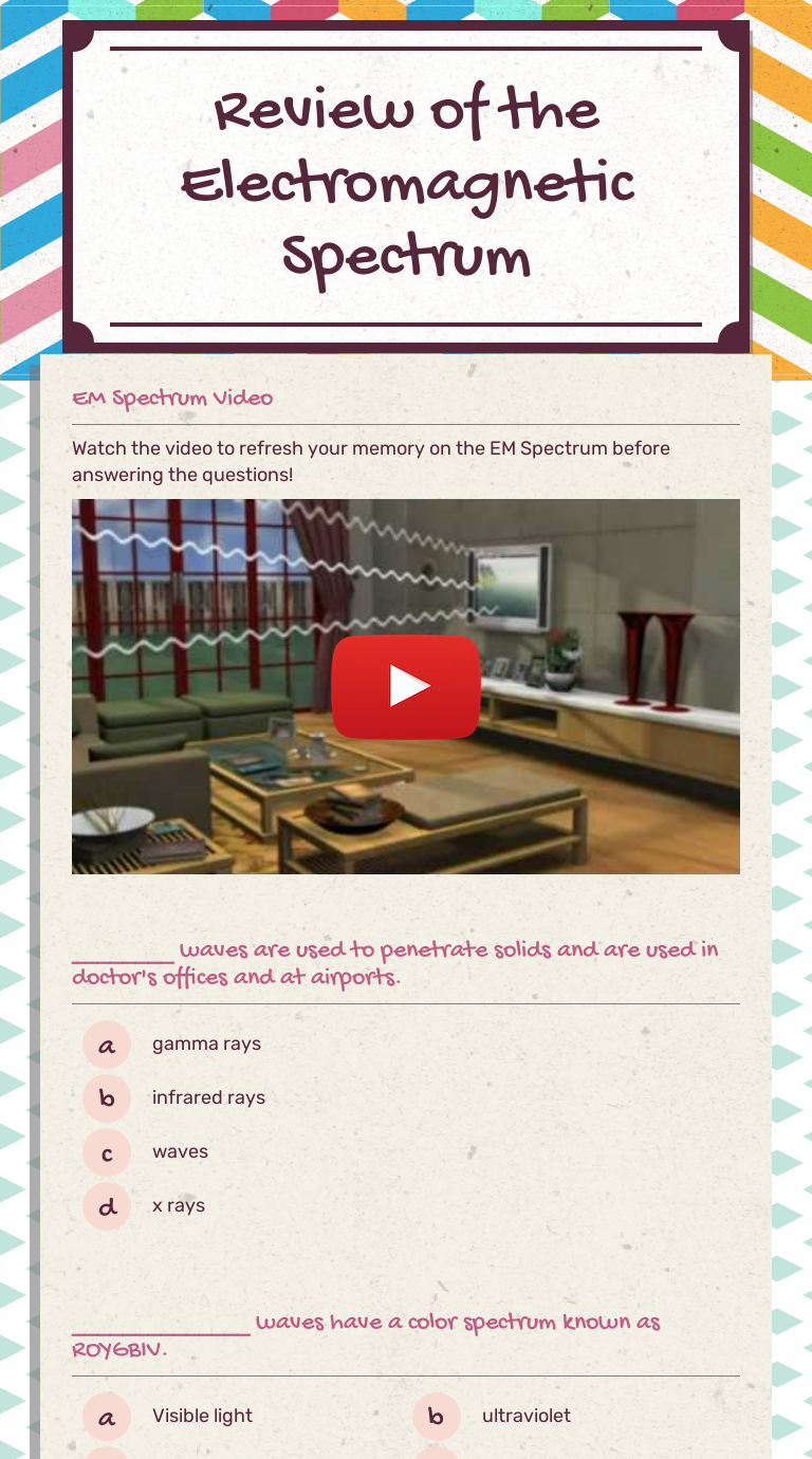 Electromagnetic Spectrum Worksheet Answer Key - Explore ... The electromagnetic spectrum worksheet answer key when you find a template that you would like to use you could also to open it and start customizing it. Help you get what you want. Some of the worksheets for this concept are waves electromagnetic spectrum work electromagnetic spectrum work waves and electromagnetic spectrum review work ...