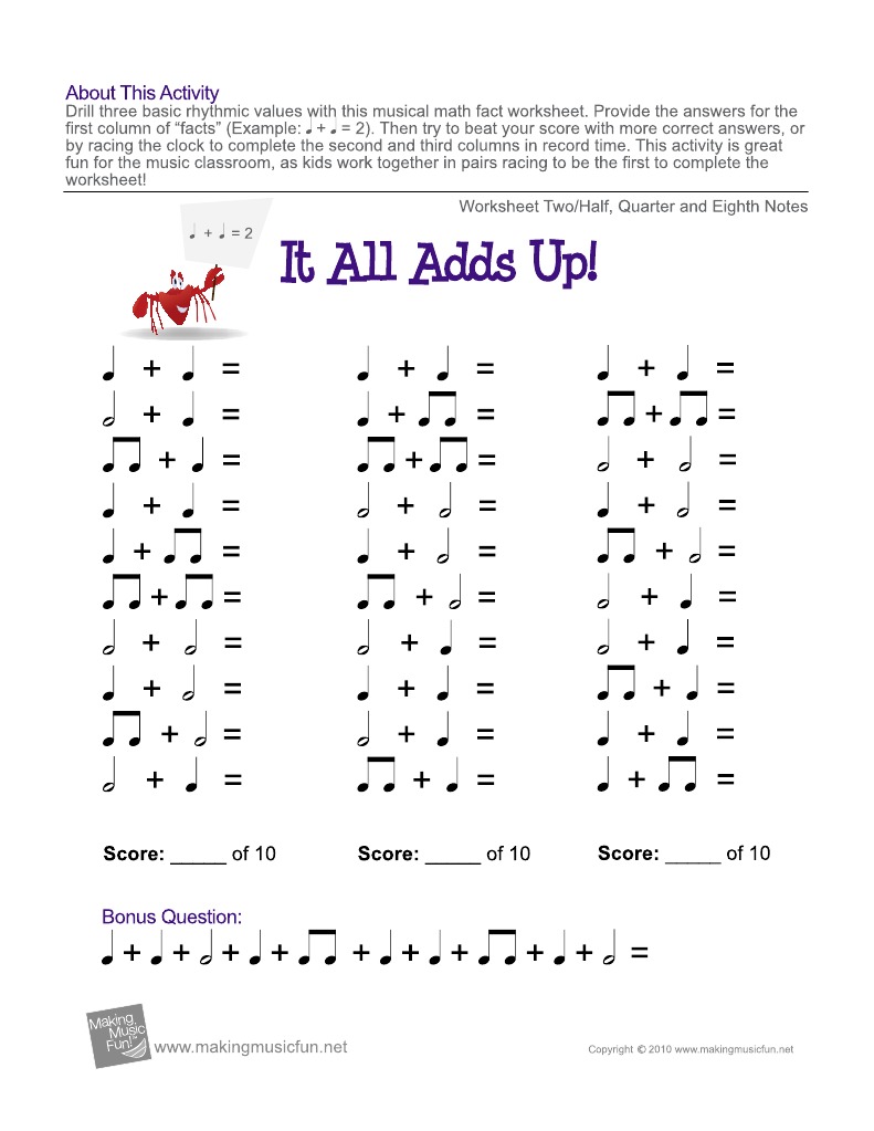 It All Adds Up, Worksheet One - YouTube Add the beats of whole, half and quarter notes.Middle School Theory page 223rd 4th Grade supplement It All Adds Up! | Free Music Theory Worksheet (Rhythm ... Sep 4, 2014 - It All Adds Up! | Free Rhythm Worksheet One It All Adds Up! | Free Rhythm Worksheet One/Whole, Half and Quarter Note MakingMusicFun.net | Creative Resources for Elementary Music Education
