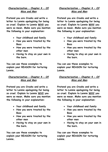 Of mice and men worksheet. Carlson in Of Mice & Men by John Steinbeck ... Carlson in Of Mice and Men. Carlson from John Steinbeck's 1937 novella, Of Mice and Men, is a plain-spoken, good-natured laborer on the ranch that owns a Luger pistol.Though Carlson is a side ... Of Mice And Men Activity Worksheets - Fireboat Our of mice and men worksheets include work on key quotes, practice exam questions, display materials, profiles of key characters and more. Of mice and men creative writing activity • use after reading chapter 2 ; Worksheet For Cinematic And Theatrical Elements And Their Effects. Of Mice and Men Activities - Ms. Strazzulla's English Classes Quote Quizzes: Chapter 1 & 2. Chapter 3. Chapter 4 - 6. Crossword Puzzle: Interactive Crossword Puzzle. JeopardyGame -- Review Of Mice and Men using Jeopardy. Other Quizzes: Below are links to quizzes on the Internet. Of Mice and Men Multiple Choice. Of Mice and Men Worksheets and Activities | Teaching Resources Of Mice and Men Worksheets and Activities. Subject: English. Age range: 14-16. Resource type: Worksheet/Activity. 4.4 5 reviews. phines08. 4.8428571428571425 12 reviews. Last updated. ... Various activities and worksheets focusing on themes and language devices in the novel. Creative Commons "Sharealike" Reviews. 4.4 Something went wrong ...