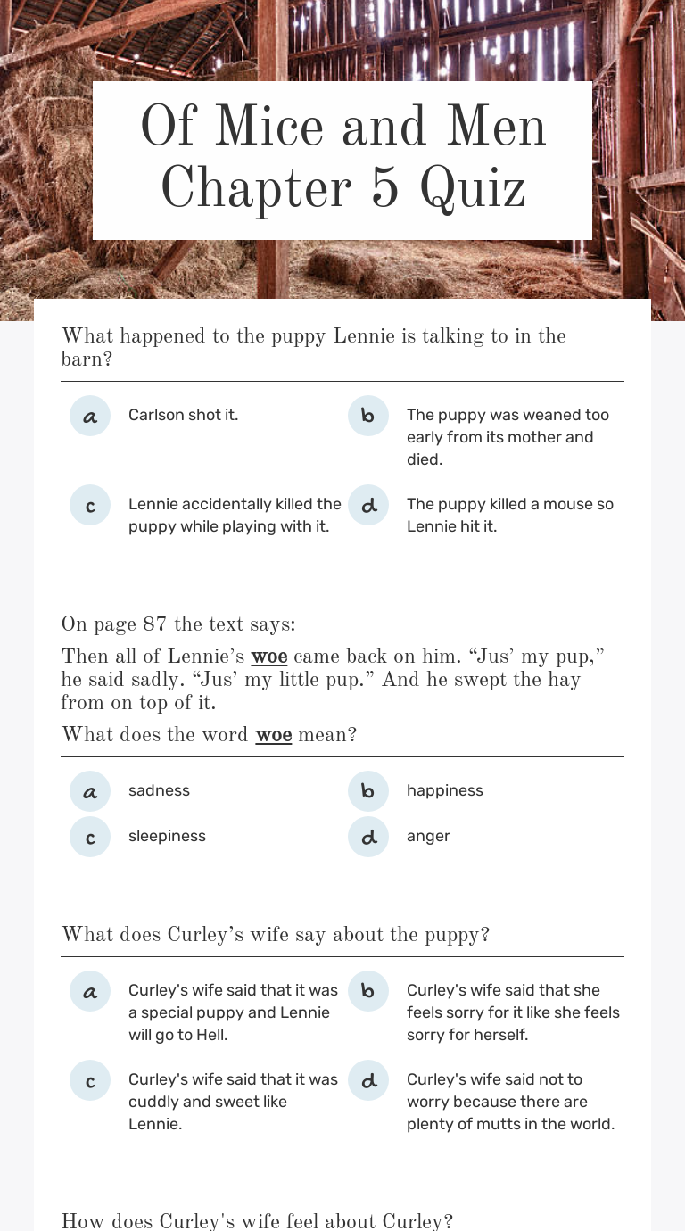 study.com › learn › lessonCurley's Wife in Of Mice & Men | Quotes, Description ... Nov 02, 2021 · Curley's wife is a critical character in Of Mice and Men by John Steinbeck. The protagonists of the novella, George and Lennie, are heading to work at a ranch after fleeing from their last job.