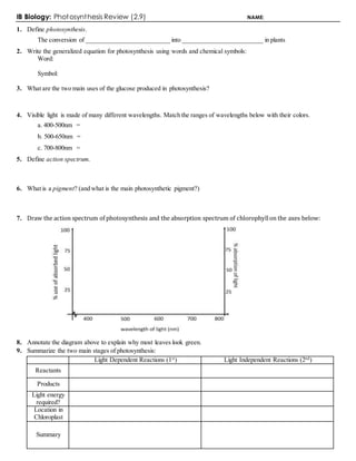 Overview of Photosynthesis.doc - Name: _ Date: _ Period ... View Overview of Photosynthesis.doc from BIOL 101 at Harrisburg University of Science and Technology. Name: _ Date: _ Period: _ Photosynthesis Review Worksheet 1. What is the overall equation for