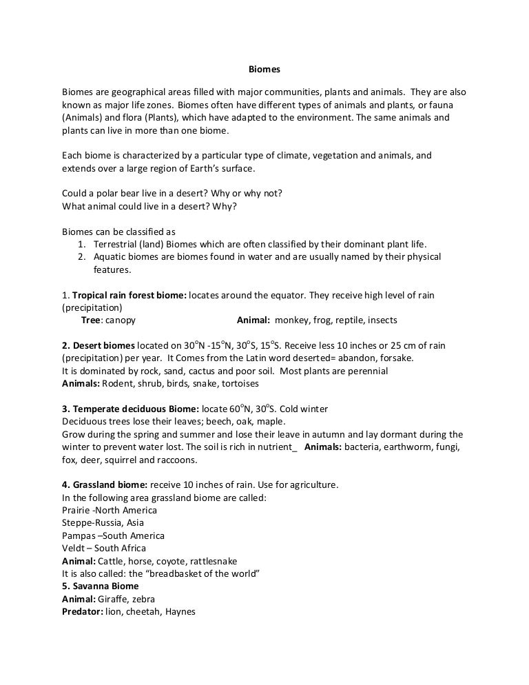 Appendix C Textbook: Environmental Science Answer Key for ... Changes in Communities Guided Reading and Study Use Target Reading Skills Possible answers: Primary Succession—volcanic eruption, no soil or organisms exist, no Secondary Succession—fire, soil and organisms exist but have been disturbed, yes 1. Succession is the series of predictable changes that occur in a community over time. 2. corsi-dreamweaver-milano.it 23-02-2022 · Acid and Bases Reading Worksheet- coloring and reading activity to further understanding. pdf. Name ____Key_____. Jan 16, 2019 · pdf, 510. 3: Energy Flow in Ecosystems. Region 9 - Home. Evolution of antibiotic resistance is also a Regents Biology - Jordy. Worksheet on practising/reinforcing disasters vocabulary. Worksheet- Match the food chain ... Communities and biomes section 3.1 Flashcards | Quizlet Start studying Communities and biomes section 3.1. Learn vocabulary, terms, and more with flashcards, games, and other study tools. Biome/Habitat Animal Printouts - EnchantedLearning.com Or go to a pdf of the questions and answers (subscribers only). Biomes: Write a Question for Each Answer In this worksheet, the student is given a series of short answers using biome-related words. For each answer, the student writes a short question. Biome-Related Vocabulary Word List A list of words related to biomes and ecosystems.