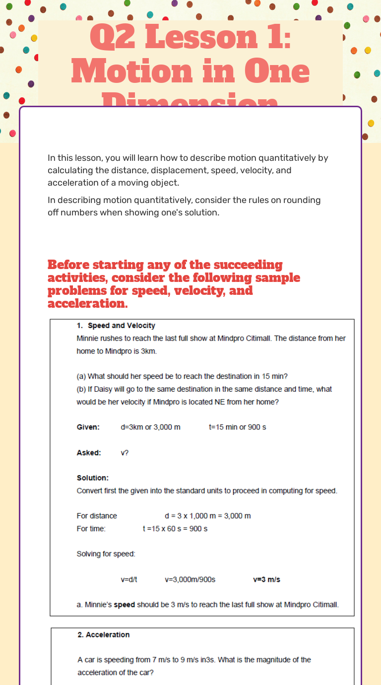 Physics Worksheet Motion In One Dimension - Worksheet Way One dimensional motion worksheet solve the following problems on a separate sheet of paper. In these formulas the acceleration is assumed to be constant. A car moving at 10 m s speeds up uniformly to a speed of 30 m s in a time of 5 seconds. Velocity is the rate of change of displacement with respect to time.