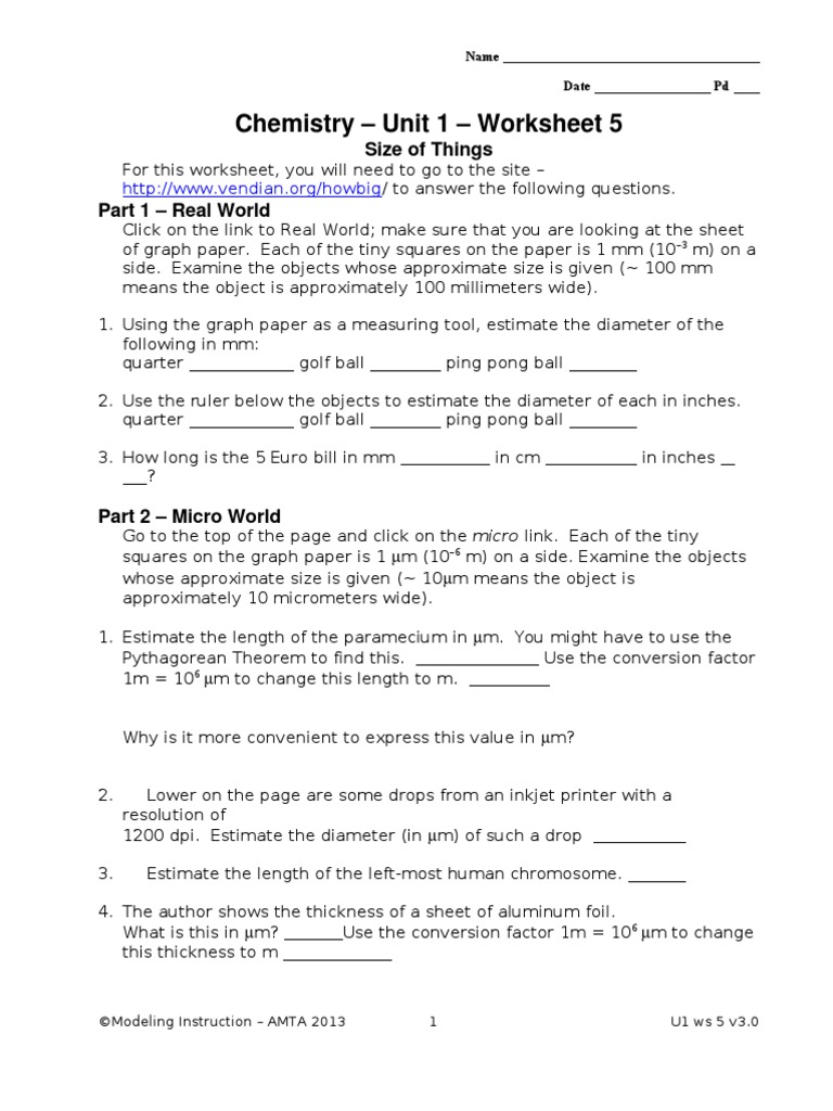PDF Date Pd Chemistry - Unit 1 - Worksheet 5 3. How long is the 5 Euro bill in mm in cm in inches ? Part 2 - Micro World Go to the top of the page and click on the micro link. Each of the tiny squares on the graph paper is 1 µm (10-6 m) on a side. Examine the objects whose approximate size is given (~ 10µm means the object is approximately 10 micrometers wide). 1. Estimate the ... Honors_Chemistry_-_Unit_5_Worksheet_1 - Name Date Pd ... View Honors_Chemistry_-_Unit_5_Worksheet_1 from CHEMISTRY CHM152 at Chandler-Gilbert Community College. Name Date Pd Honors Chemistry - Unit 5 Worksheet 1 Molecular Compounds 1. Name each of the usscouts.org › mb › worksheetsChemistry - U.S. Scouting Service Project Chemistry Scout's Name: _____ Chemistry - Merit Badge Workbook Page. 8 of 10 c. Using reasons from chemistry, describe the effect on the environment of ONE of the following: 1. The production of aluminum cans 2. Burning fossil fuels 3. Single-use items, such as water bottles, bags, straws, or paper d. Chemistry Unit 1 Worksheet 5 Size Of Things → Waltery ... Chemistry Unit 1 Worksheet 5 Nidecmege Some of the properties of the atom and its component parts are summarized in Table 1. Chemistry unit 1 worksheet 5 size of things. Modeling Instruction AMTA 2013 2 U1 ws 5 v30 Go back to the top of the page and click on the nano link. Each of the tiny squares on the graph paper is 1 nm 109 m on a side.