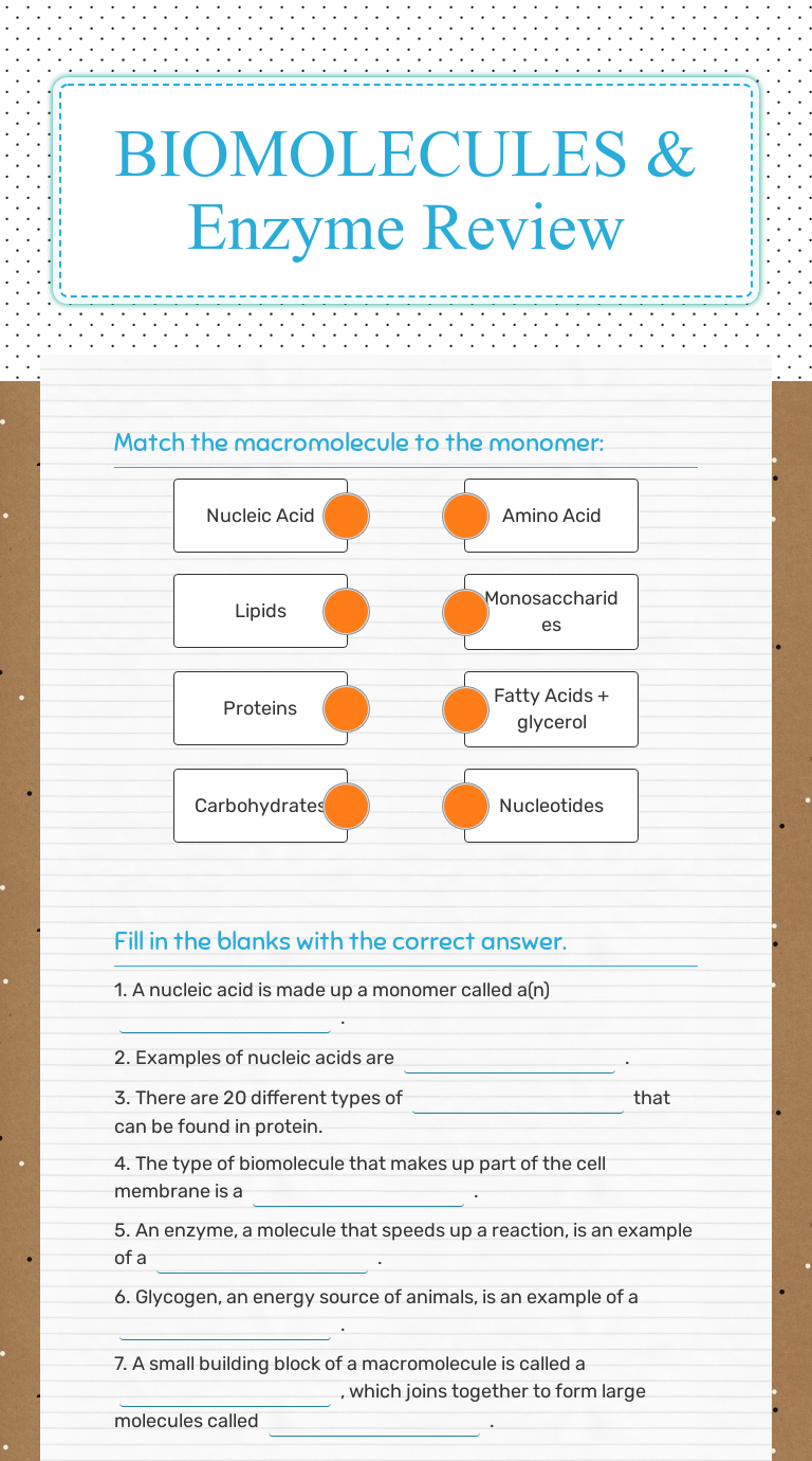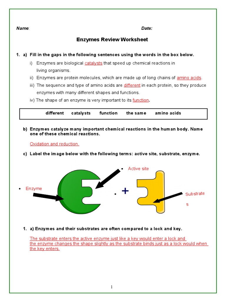 Enzyme Review Sheet Answers | PDF Enzyme Review Sheet Answers - Free download as PDF File (.pdf) or read online for free. a sample test marked about enzymes. Name: Date: é Enzymes Worksheet 'This worksheet accompanies Enzymes.ppt and Digestive Enzymes. ppt 1. a) Fillin the gaps in the following sentences using the...