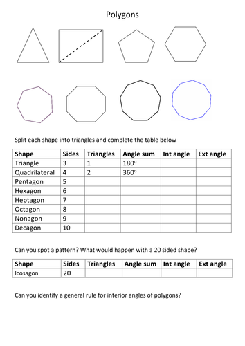 Polygons Worksheets - Math Worksheets 4 Kids (21 Worksheets) Angles in Polygons Worksheets Fine-tune your skills using the angles in polygons worksheets with skills to find the sum of interior angles of regular and irregular polygons, find the measure of each interior and exterior angle and much more. (35 Worksheets) Geometry Worksheets - Math-Drills Welcome to the geometry worksheets page at Math-Drills.com where we believe that there is nothing wrong with being square! This page includes Geometry Worksheets on angles, coordinate geometry, triangles, quadrilaterals, transformations and three-dimensional geometry worksheets.. Get out those rulers, protractors and compasses because we've got some great worksheets for geometry! Angles in Polygons Worksheet - GCSE Maths [FREE] Section 1 of the angles in polygons worksheet contains 32 skills-based angles in polygons questions, in 2 groups to support differentiation. Section 2 contains 3 applied angles in polygons questions with a mix of worded problems and deeper problem solving questions. Answers and a mark scheme for all angles in polygons questions are provided. 40 polygon and angles worksheet - Worksheet Master Polygon and angles worksheet. Angles in polygons worksheets. Scroll down the page for more examples and solutions on the interior angles of a polygon. The formula to find the sum of the interior angles of any polygon is sum of angles n 2 180 where n is the number of sides of the polygon. A lesson covering rules for finding interior and exterior ...