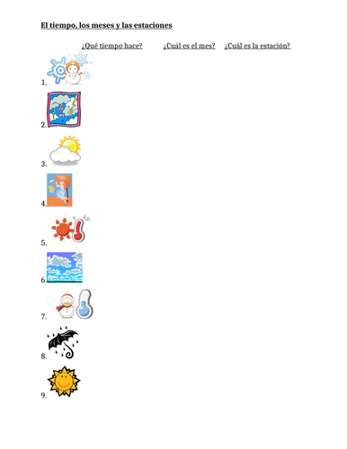 Spanish Weather and seasons Worksheets | Free Printable ... Spanish Weather and seasons Worksheets. Get Spanish questions and answers in Spanish to improve your Spanish language skills. This printable worksheet makes learning easy! Leave a Reply Cancel reply. Your email address will not be published. Required fields are marked * Comment *