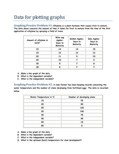 Graphing Science Data Worksheets & Teaching Resources | TpT by. Dr Dave's Science. 4. $6.00. PDF. A set of six data tables to practice data and graphing. Students answer questions from the table and then use one set of data to plot a graph on custom graph paper. Great for 8th grade science test prep review. Also can be used for a science sub plan and a science substitute lesson plan.A no prep.