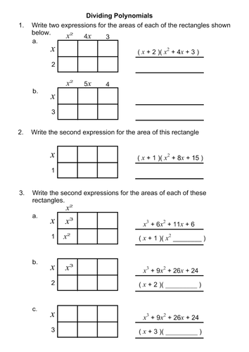 Dividing Polynomials Worksheets Division Division of Polynomials Worksheets Incorporate this extensive range of dividing polynomials worksheet pdfs featuring exercises to divide monomials by monomials, polynomials by monomials and polynomials by polynomials employing methods like factorization, synthetic division, long division and box method.