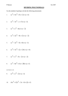 › factoringFactoring Polynomials Worksheets Factoring is a process of splitting the algebraic expressions into factors that can be multiplied. Included here are factoring worksheets to factorize linear expressions, quadratic expressions, monomials, binomials and polynomials using a variety of methods like grouping, synthetic division and box method.