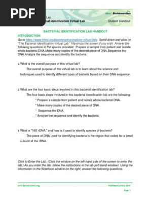 Bacterial Identification Lab Flashcards | Quizlet The piece of DNA used for identifying bacteria; The identification relies on matching the sequence from your sample against a database of all known 16S rDNA sequences, As the pathology lab technician, what is your task in this virtual lab? to identify a bacterial sample received from a clinician. Extracting DNA involves which initial step? Bacterial Identification Virtual Lab | HHMI's BioInteractive This virtual lab will familiarize you with the science and techniques used to identify different types of bacteria based on their DNA sequences. Bacterial Identification Virtual Lab | HHMI's BioInteractive Bacterial Identification Lab Worksheet Key - groups.google.com All groups and messages ... ... Bacterial Identification Lab Worksheet Answers : Bacterial ... Lab #14 bacterial identification virtual lab. An hhmi biointeractive lab on "bacterial identification" can substitute for the unknown bacteria project incorporated into .