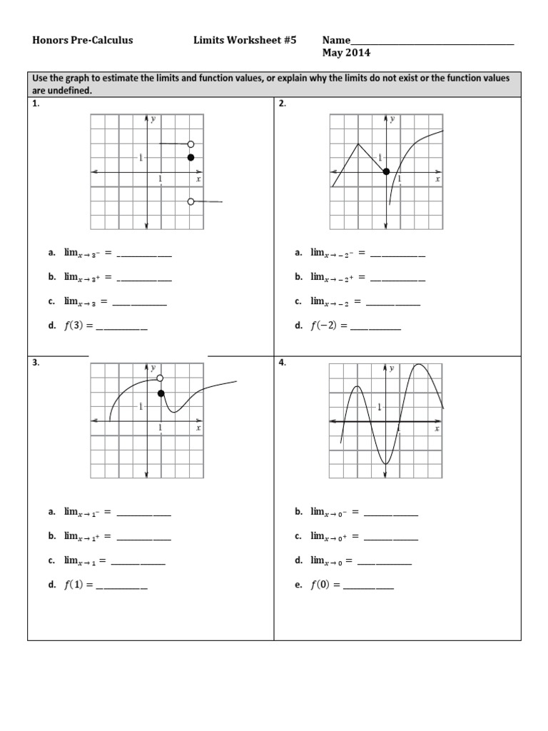 PDF Honors Pre-Calculus Limits Worksheet #5 Name May 2014 Answers: , 1a. 2 1b. -2 1c. does not exist 1d. 1 , 2a. 2 2b. 2 2c. 2 2d. 2 , 3a. 3 3b. 2 3c. does not exist 3d. 2 , 4a. -3 4b. -3 4c. -3 4d. -3 , 5a. 3 5b. -2 5c. does not exist 5d. 3 , 6a. 1 6b. 1 6c. 1 6d. 3 , 7. 8, -19. 010. 1, 11. does not exist 12. does not exist 13. 14. 15. 12 16. 2 17a. 0 17b. 0 , 17c. 0 17d. 1 17e. 0 17f. does not exist ,
