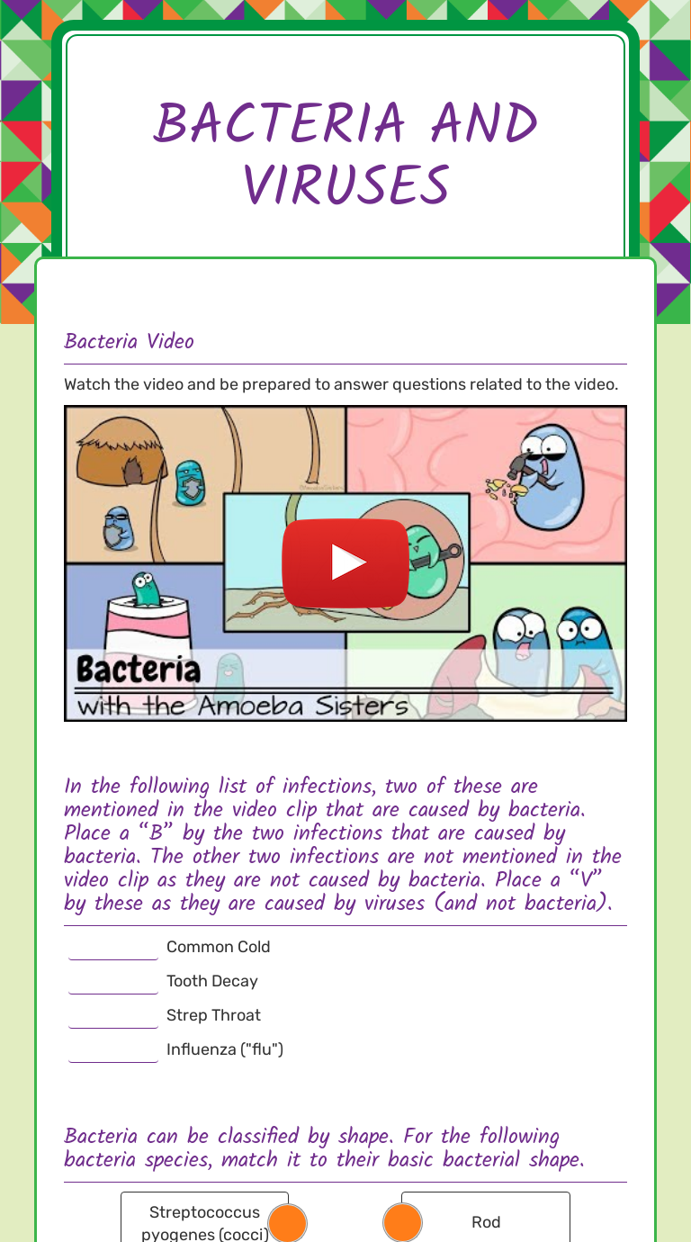 Virus And Bacteria Worksheet Teaching Resources | TpT - TeachersPayTeachers this worksheet contains basic conceptual questions about bacteria and viruses.in this worksheet, students will answer questions about the following terms:bacteria virusesbacteriophagepathogenscyanobacteriaconjugationendosporebinary fissionwhat's included in this resource?printable and editable student worksheet (pdf and word document)paperless …
