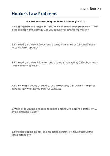 Differentiated Hooke's Law worksheets | Teaching Resources Two worksheets to help pupils practice using and rearranging the equation for Hooke's Law: F=kx. A relatively simple equation that suggests that, for an elastic material i.e. a spring, the amount of force applied is equal to the extension of the material. K is the spring constant - how stiff a spring is. I hope you find it useful