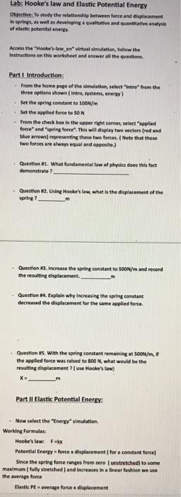 PDF Physics 11: Hooke's Law Worksheet ANSWERS - Ms. Poulton's Science ... Physics 11: Hooke's Law Worksheet ANSWERS. 1. (a) What is the formula relating the force of a spring and its distortion? Force of a spring = -‐ (constant) ...2 pages Hookes Law Worksheets - Learny Kids 1. Physics 07-02 Hookes Law and Simple Harmonic Motion Name ... 2. Physics 02-04 Tension, Hookes Law, Drag, and Equilibrium 3. Hookes Law 4. F=1000. x () m 25 m.) 5. The Spring: Hookes Law and Oscillations 6. forces & Newtons laws of motion 7. Physics Conservation of Energy Worksheet Solutions 8. Hooke's Law and Simple Harmonic Motion