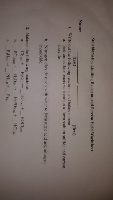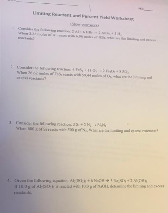 Solved PER Limiting Reactant and Percent Yield Worksheet ...