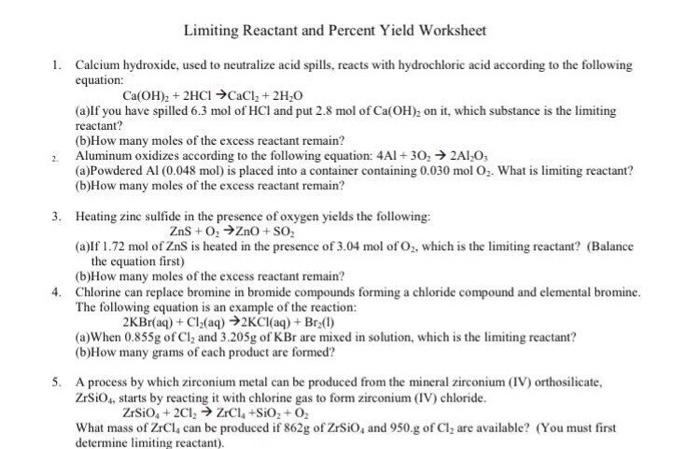 Limiting Reagents and Percentage Yield Worksheet Answers ...