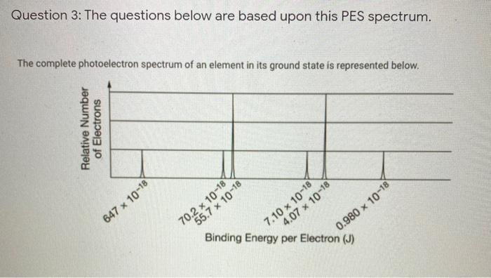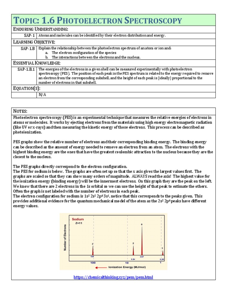 Photoelectron Spectroscopy, Spectrum, PES - AP Chemistry Worksheet Practice Unit 1.6: Photoelectron Spectroscopy (PES) Determining Binding Energy, Element's Name, & Electron Orbital, Electron Configuration, etc. Comparing Spectra of Two Atoms Justifying Differences in Peak Height and Binding Energy Over 20 PES Diagrams This worksheet is also available in Self-grading Google Form Organized Question Sets
