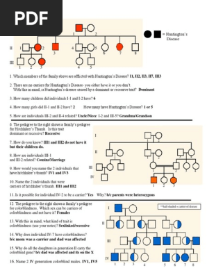PDF Interpreting a Human Pedigree Use the pedigree below to answer 1-5 Use the pedigree below to answer 6-12 . Shaded individuals have Huntington's Disease . 6. Write the generation on the pedigree numbers (roman numerals). 7. Which members of the family above are afflicted with Huntington's Disease? ... Pedigree Worksheet 3 of 3 . Title: Pedigree Worksheet Author: Tablet PC Created Date: 11/12/2009 9:54:03 PM ...
