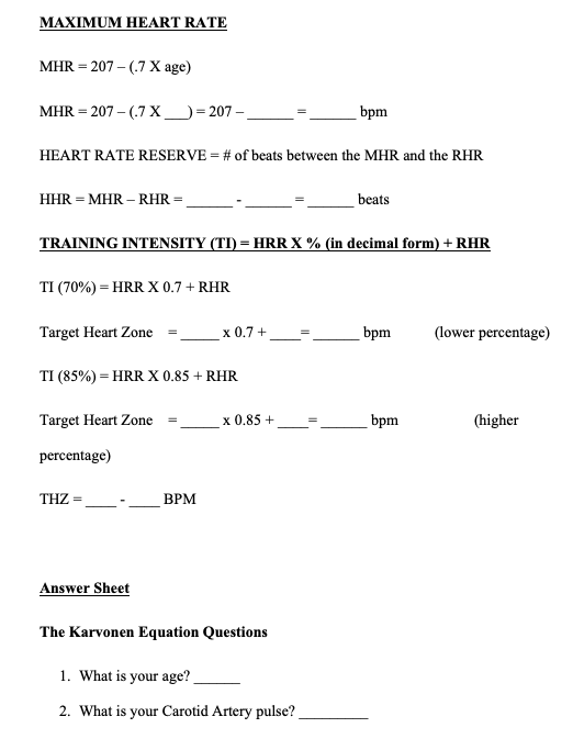 Target_Heart_Rate_Worksheet_-_ - Name_ Target Heart Rate... - Course Hero 1) First of all you need the following data: A)Maximum Heart Rate — (220 - your age = MHR) My MHR = _____206____________ B)Resting Heart Rate — (count pulse at rest for 1 minute) My RHR = _____61____________ 2) Enter the above data in the following two formulas and solve.