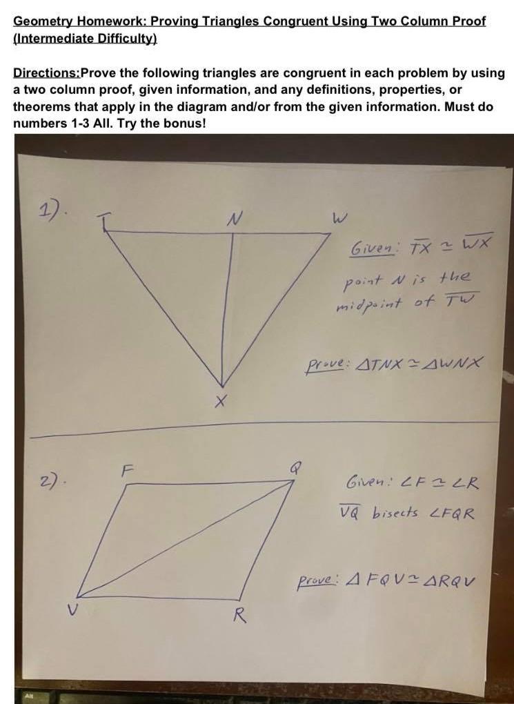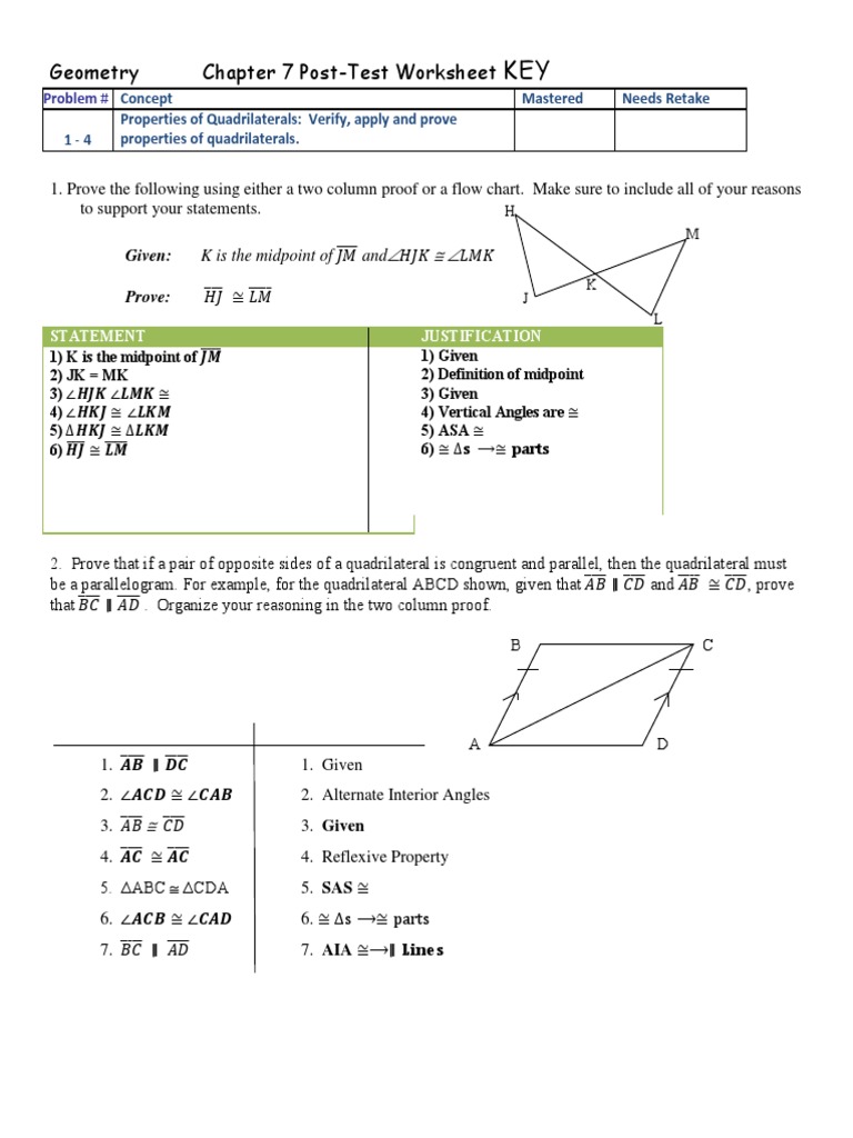 Proving that a quadrilateral is a parallelogram quiz part two Aug 19, 2020 · Quadrilaterals Proofs - Two Column Proof Practice and Quiz. by. Math Giraffe. 37. $5.00. PDF. Quadrilaterals Proofs - Two-Column Proofs with Quadrilateral Properties and Theorems: This set contains proofs with rectangles, parallelograms, rhombi, and trapezoids: - 6 sheets of quadrilaterals practice proofs (two per page) - 1 sheet of two. Equation Basics Worksheet - Wyzant Lessons Finding a GCF of Two Numbers Worksheet; Finding a GCF of Two Terms Worksheet; Functions and Inverse Functions; Graphing and Solving Inequalities; Graphing Linear Equations. Determining the Equation of a Line From a Graph Worksheet; Determining the Equation of a Line Passing Through Two Points Worksheet; Determining x and y Intercepts From a ... DOC Triangle Congruence 2 Triangle Proofs Worksheet Part 1. Tuesday, 11/13/12. 4-6: Triangle Proofs with CPCTC ( QUIZ. I can write a two-column proof to show that two triangles are congruent. PRACTICE: Triangle Proofs Worksheet Part 2. Wednesday, 11/14/12 or Thursday, 11/15/12 . Review